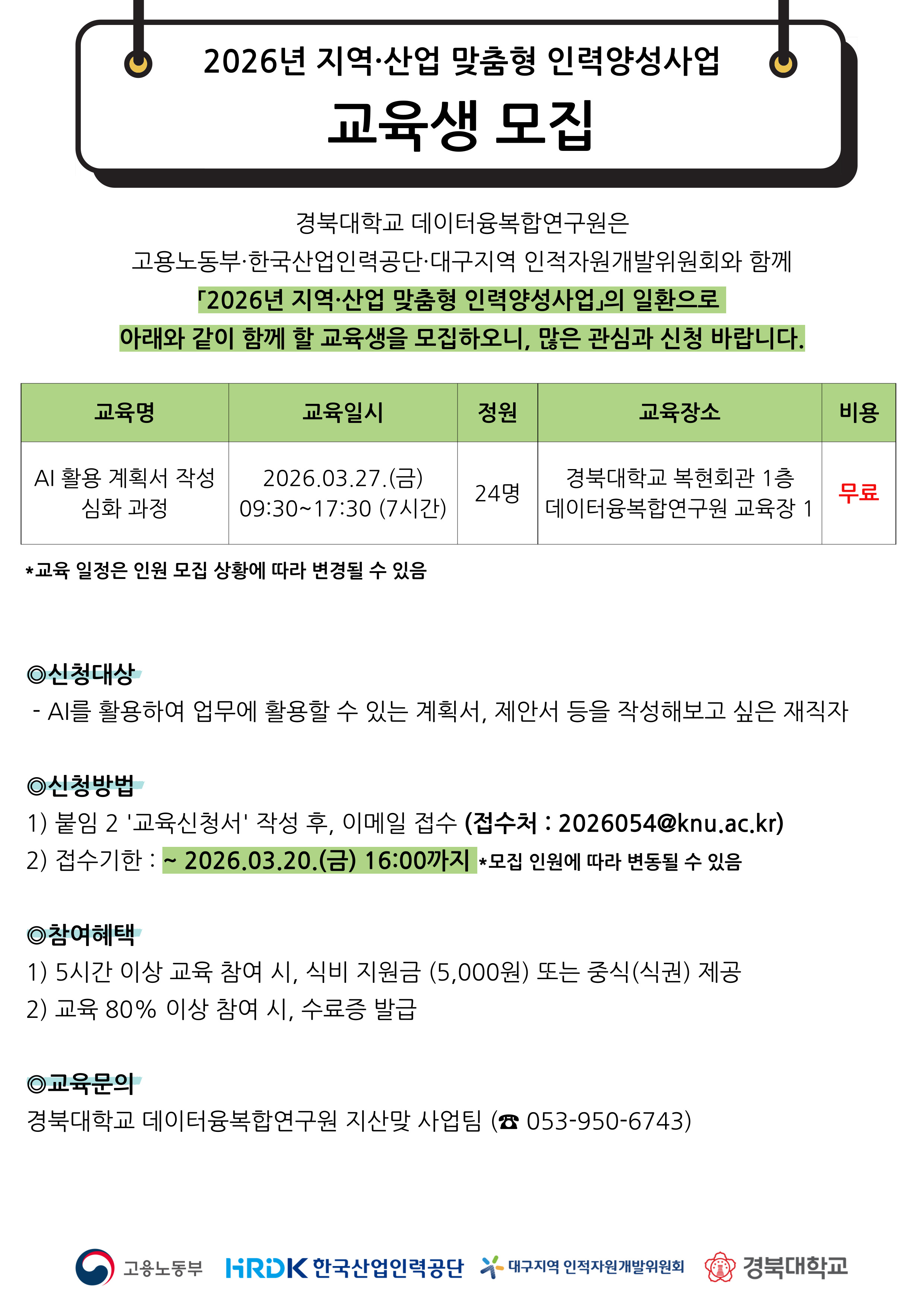 제목[경북대학교 데이터융복합연구원] AI활용 숏폼 영상제작 및 사업계획서 작성 재직자 교육 안내