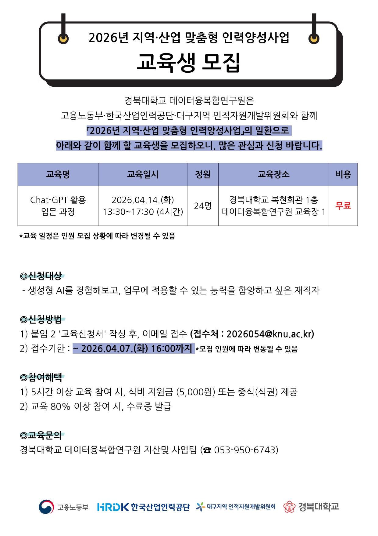 제목[경북대학교 데이터융복합연구원] Chat-GPT 활용 입문과정 재직자 무료교육 안내