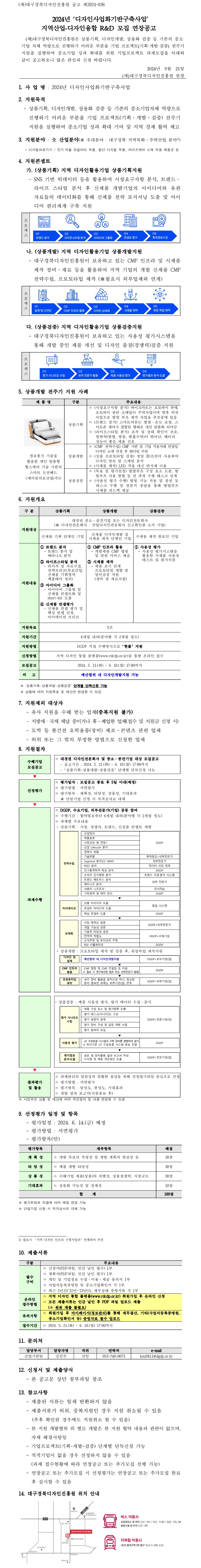 | 190 | [대구경북디자인진흥원]2024년 지역 디자인 인프라, 사업화 지원사업 안내 | 2024.05.24 |      | 3413 |